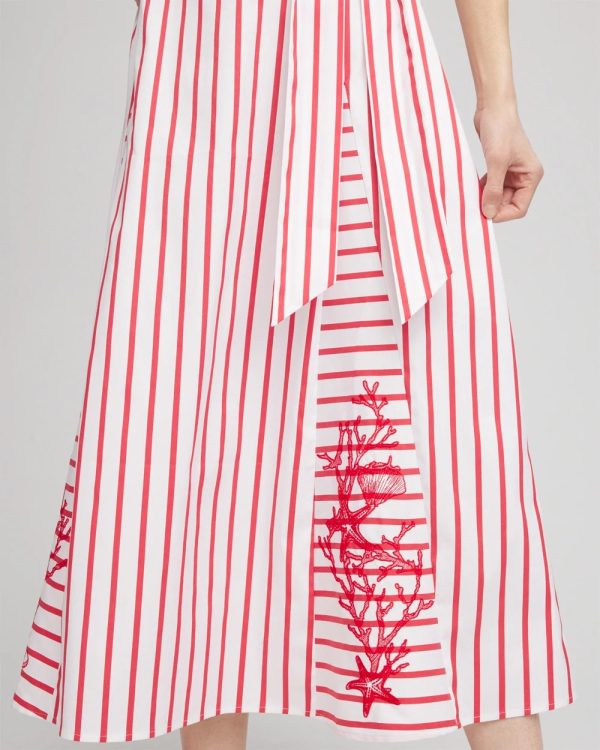 This new Striped Godet Poplin-Maxi Dress is designed with cuffed short sleeves and a breezy fit-and-flare silhouette. Its paneled skirt features inset godets with an intricate ocean-inspired coral reef embroidery, showcasing Chico’s devotion to stunning design. The perfect dress for Memorial Day, pair with matching coral reef motif jewelry for a showstopping look.