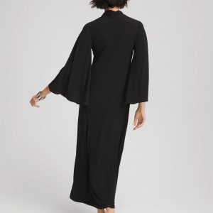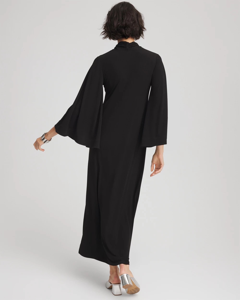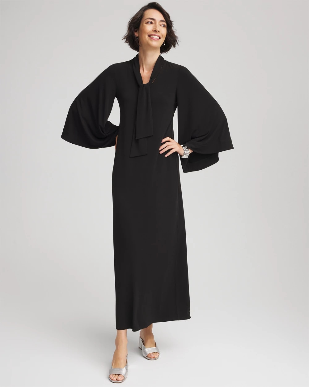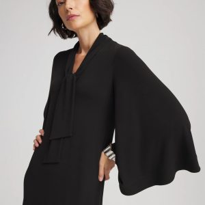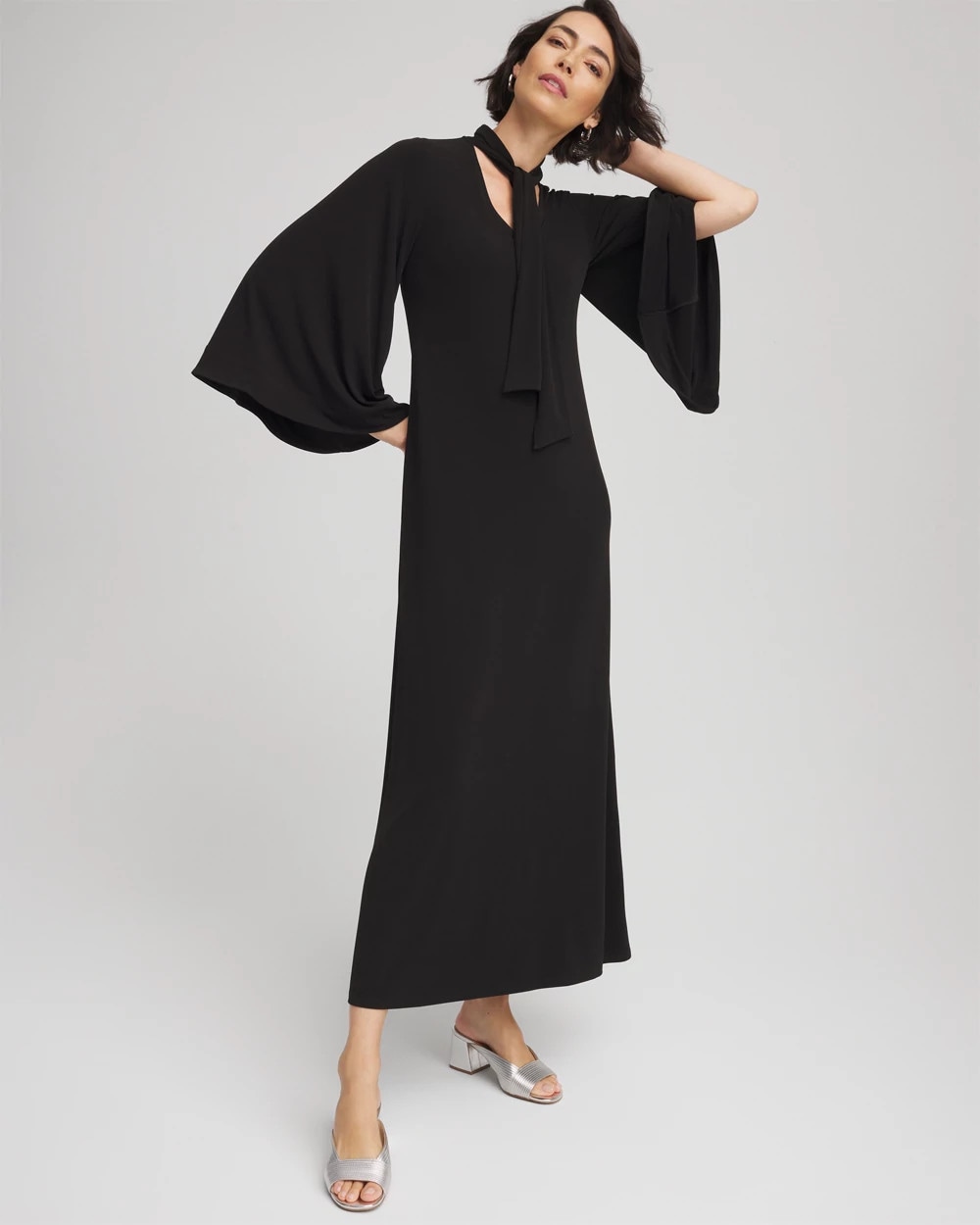 Romantic flutter sleeves and a versatile attached ribbon around the neck help define this Flutter-Sleeve Tie-Front Dress. Make a fashion statement and create a bow, wear the ties long down the front, or style like a scarf—your choice!