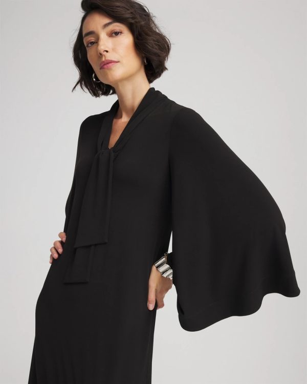 Romantic flutter sleeves and a versatile attached ribbon around the neck help define this Flutter-Sleeve Tie-Front Dress. Make a fashion statement and create a bow, wear the ties long down the front, or style like a scarf—your choice!