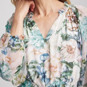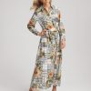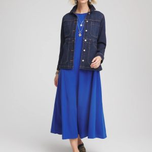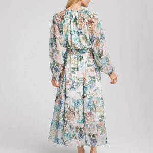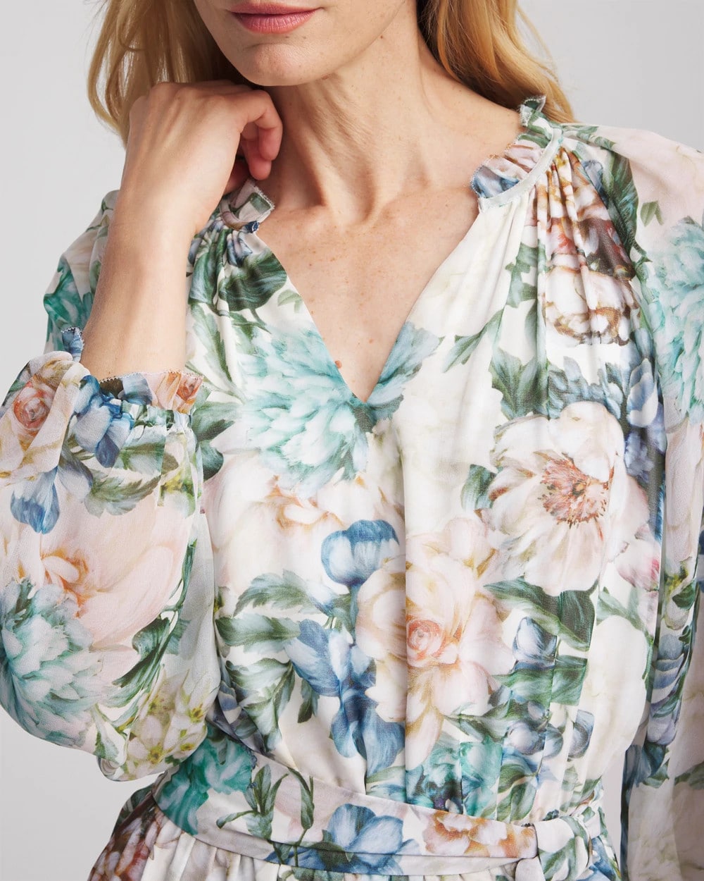 The Georgette Tie-Front Maxi Dress revamps Chico’s signature ruffled tiered maxi dress silhouette with an array of thoughtful design elements, including a mini ruffled collar with a tie-front closure, and a smocked waist. Cut from flowy lightweight fabric that carries throughout into the double-tiered skirt and long sleeves.