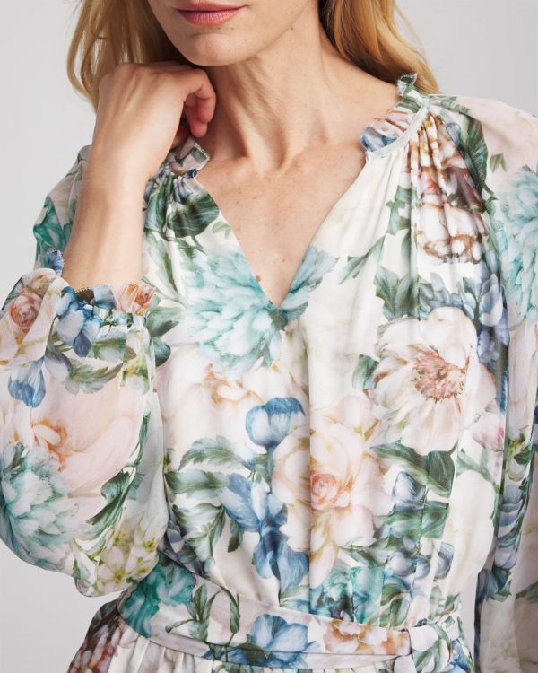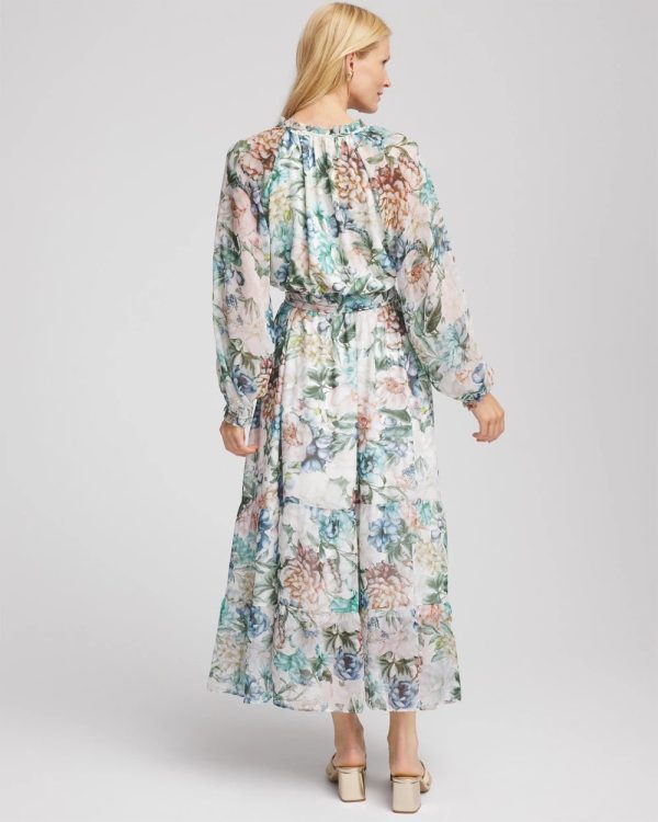 The Georgette Tie-Front Maxi Dress revamps Chico’s signature ruffled tiered maxi dress silhouette with an array of thoughtful design elements, including a mini ruffled collar with a tie-front closure, and a smocked waist. Cut from flowy lightweight fabric that carries throughout into the double-tiered skirt and long sleeves.