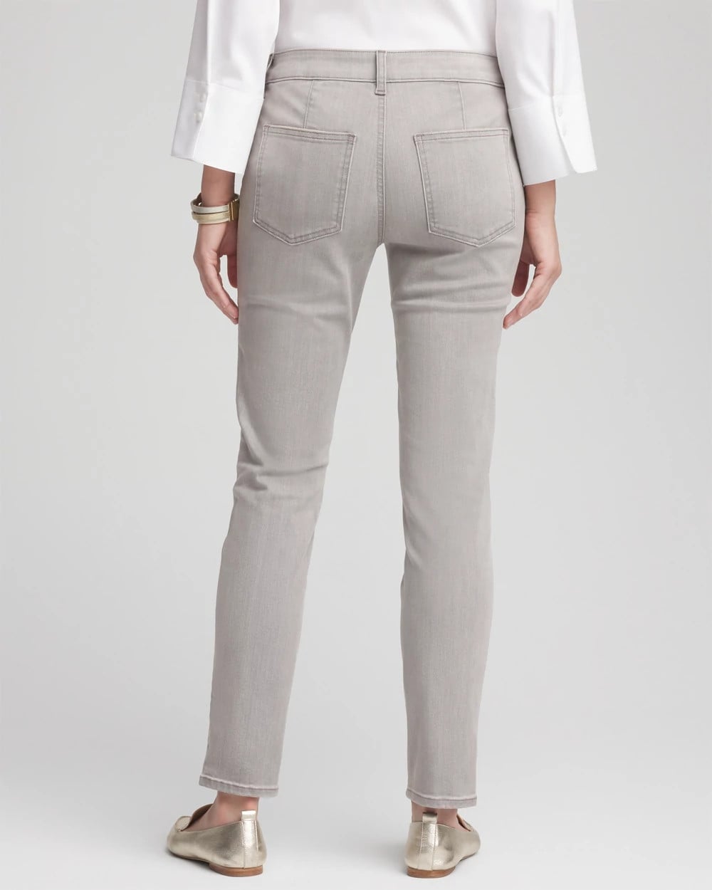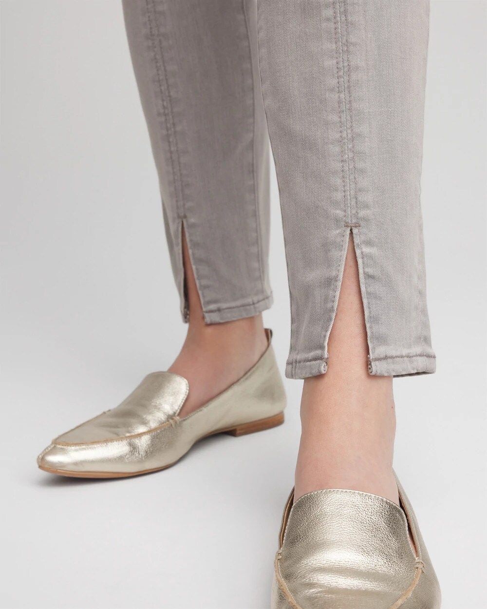 Made with a silver wash denim, this iteration of our bestselling Pull-On Slim Ankle Jegging is designed with a fashion-forward front seam detail and slit for modern appeal. Showcasing Chico’s slimmer fit with a non-functional fly front, pull-on waistline, functional back pockets, and belt loops.