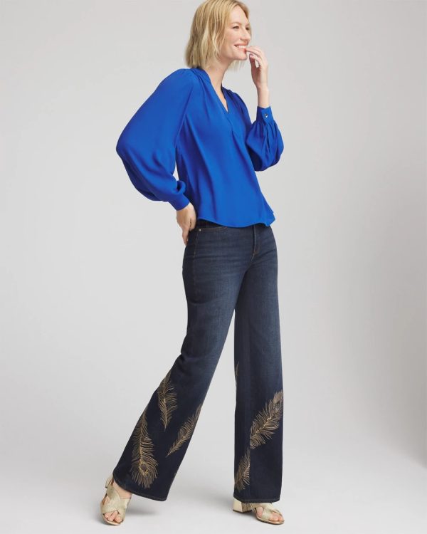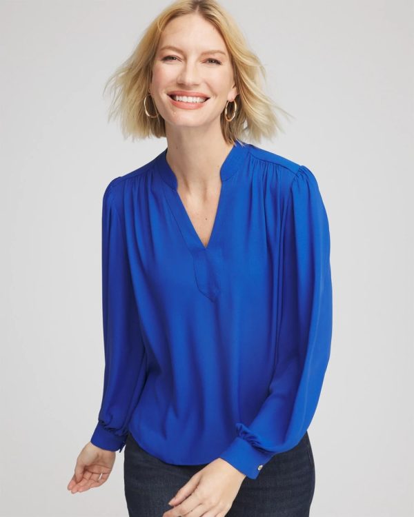 Shirring on the cuff, shoulder, front and back yoke helps define this Splitneck Pullover Crepe Blouse. Cut for a relaxed-fit from lightweight crepe. Pair this ultra-stylish top with jeans or cropped pants to strike a casual balance, Emme, Brigitte, or Juliet pants for a more upscale style.