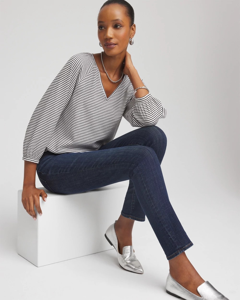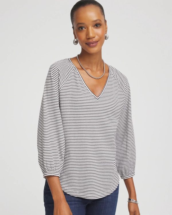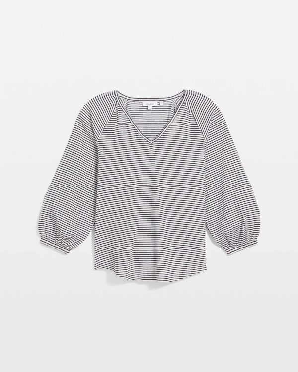 A face-framing v-neckline and jersey knit fabrication help define this elevated staple Striped Crinkled Raglan Top.