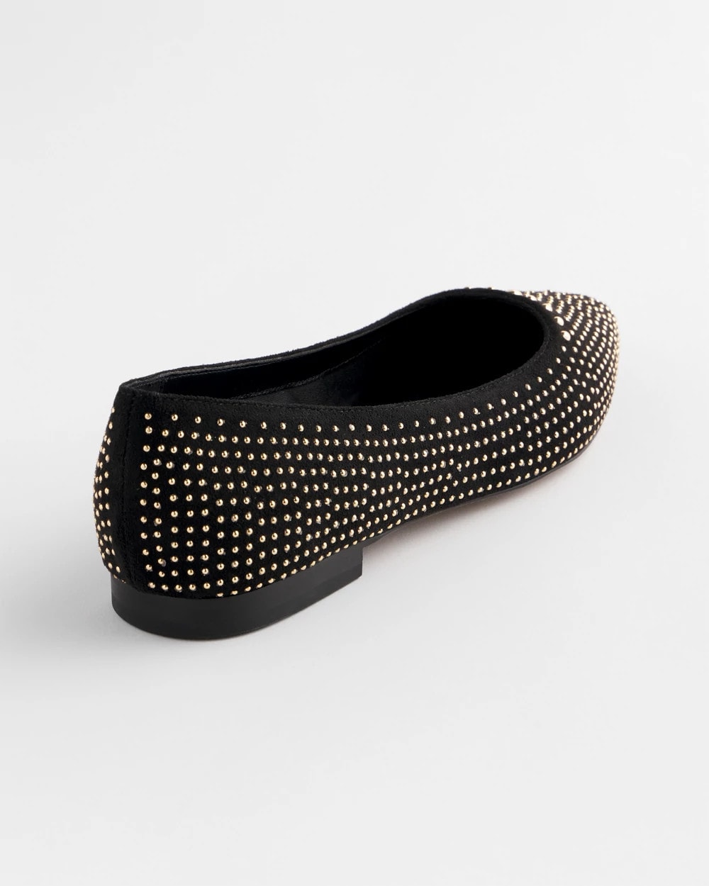These flats are cut from soft black micro-suede, showcasing gold studded hardware all over for a more luxurious style.