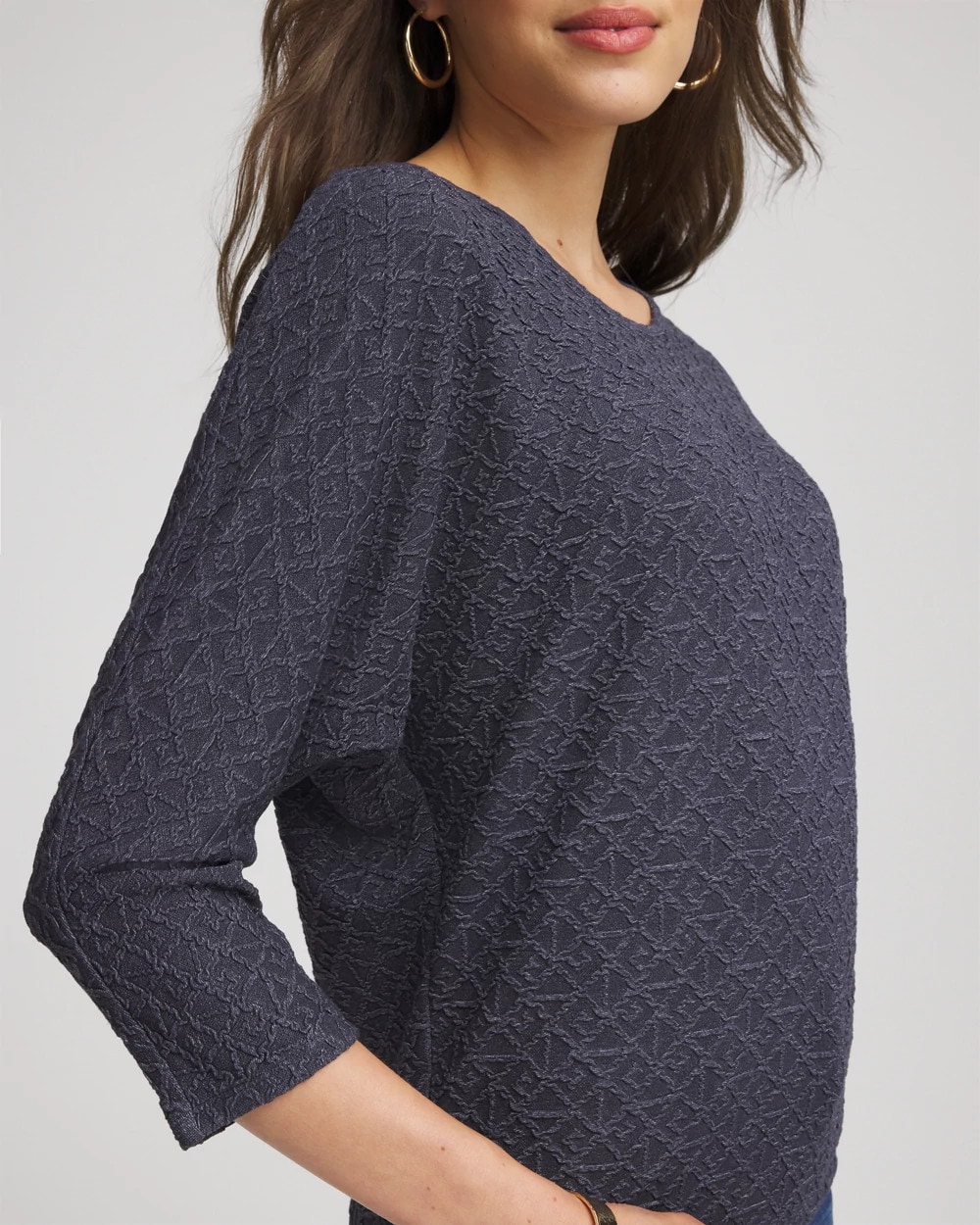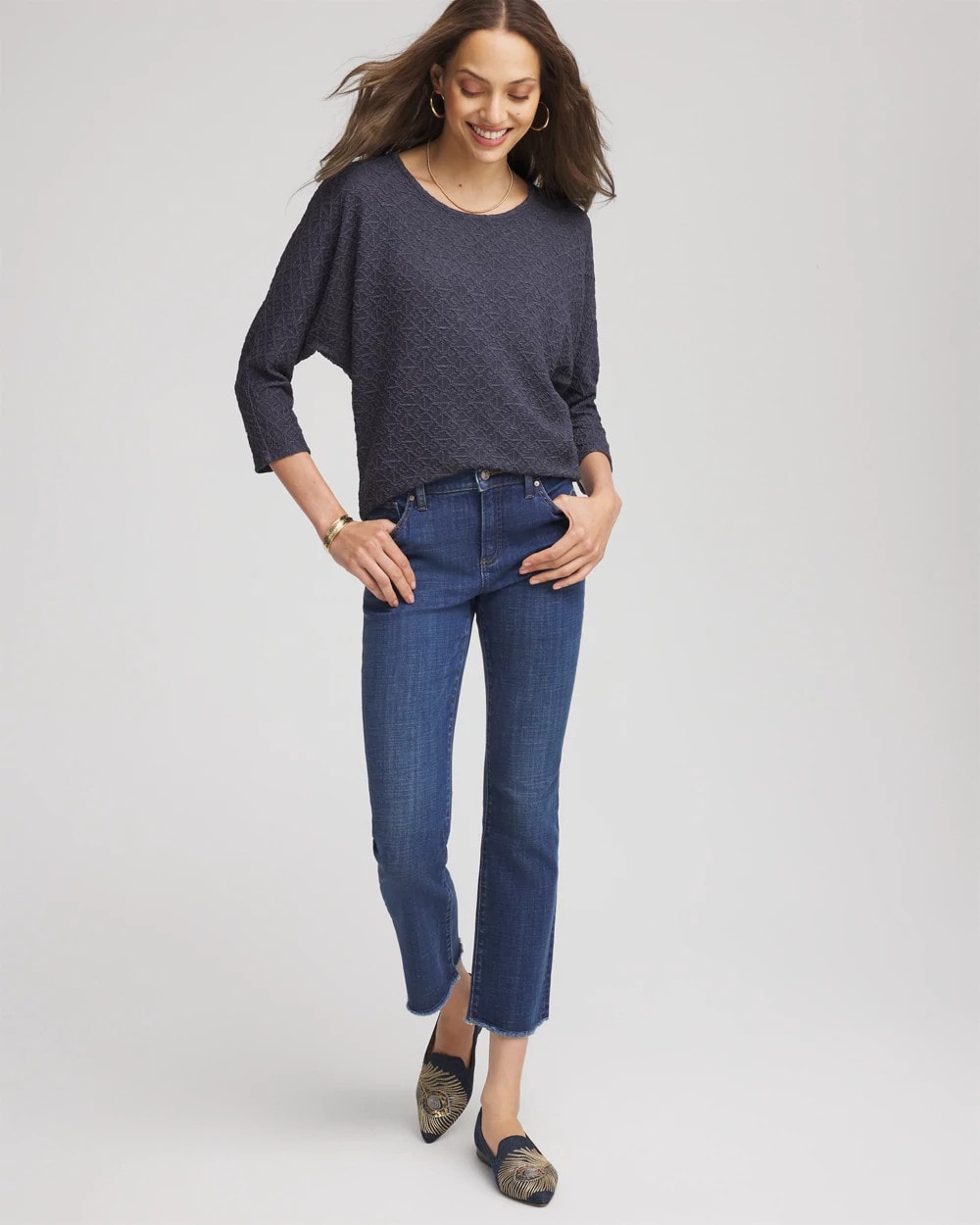 The Textured Tapered-Hem Top is cut from Chico’s luxurious jacquard fabric, crafted to look and feel elevated. This relaxed, dolman sleeved top with a slightly tapered waist can be paired with almost any pants—high or mid-rise to create a smooth silhouette. For a monochromatic style wear with the season’s matching slim pants.