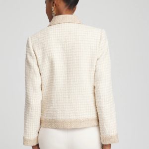 A tonal trim detail on the hem, cuffs, pockets, and lapels helps define this Tonal Neutral Tweed Jacket. Showcasing classic tweed attributes included elevated texture, plus front patch a silky lining, and stylish buttons. Featuring removable, thin shoulder pads to add structure and shape.