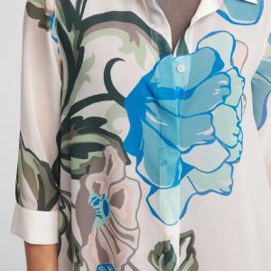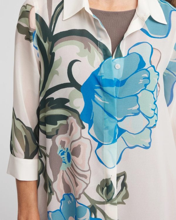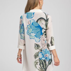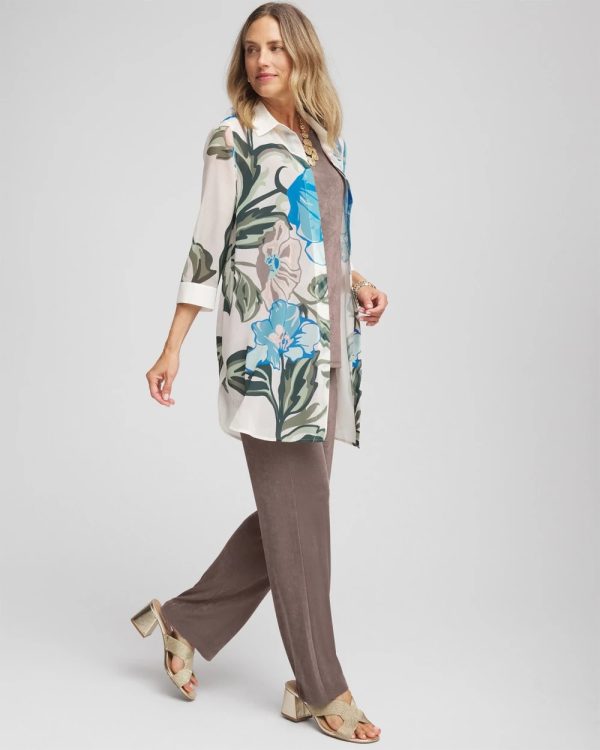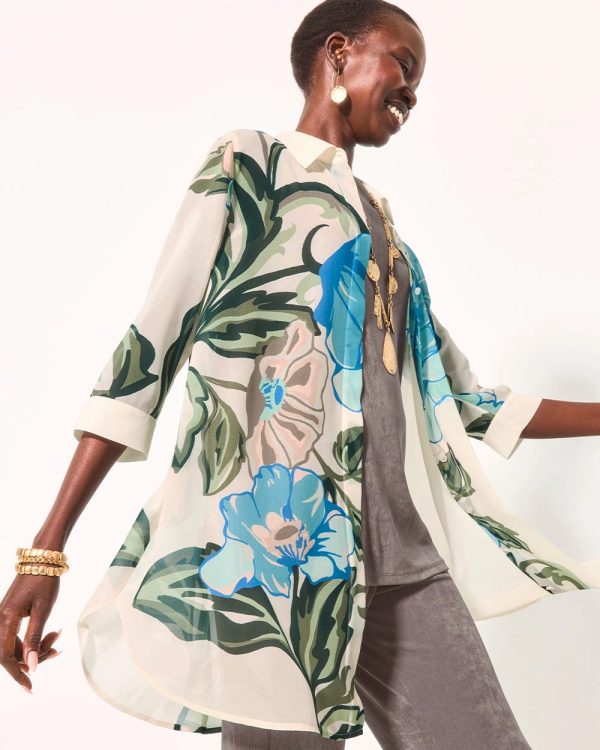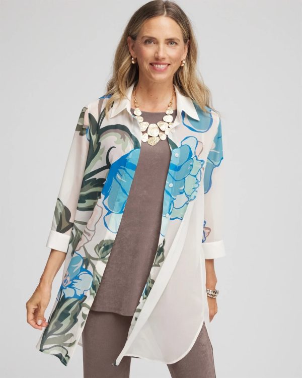An long tunic silhouette, concealed button-front placket, and blue tonal print against a neutral backdrop help define thisTravelers™ Artisanal Chiffon Tunic. Wear as a shirt or lightweight jacket and match with tanks and pants from Chico’s Travelers™ Collection.
