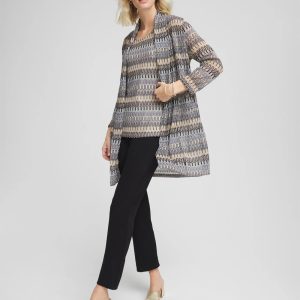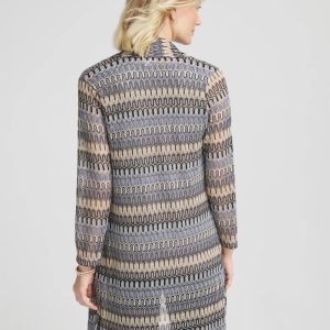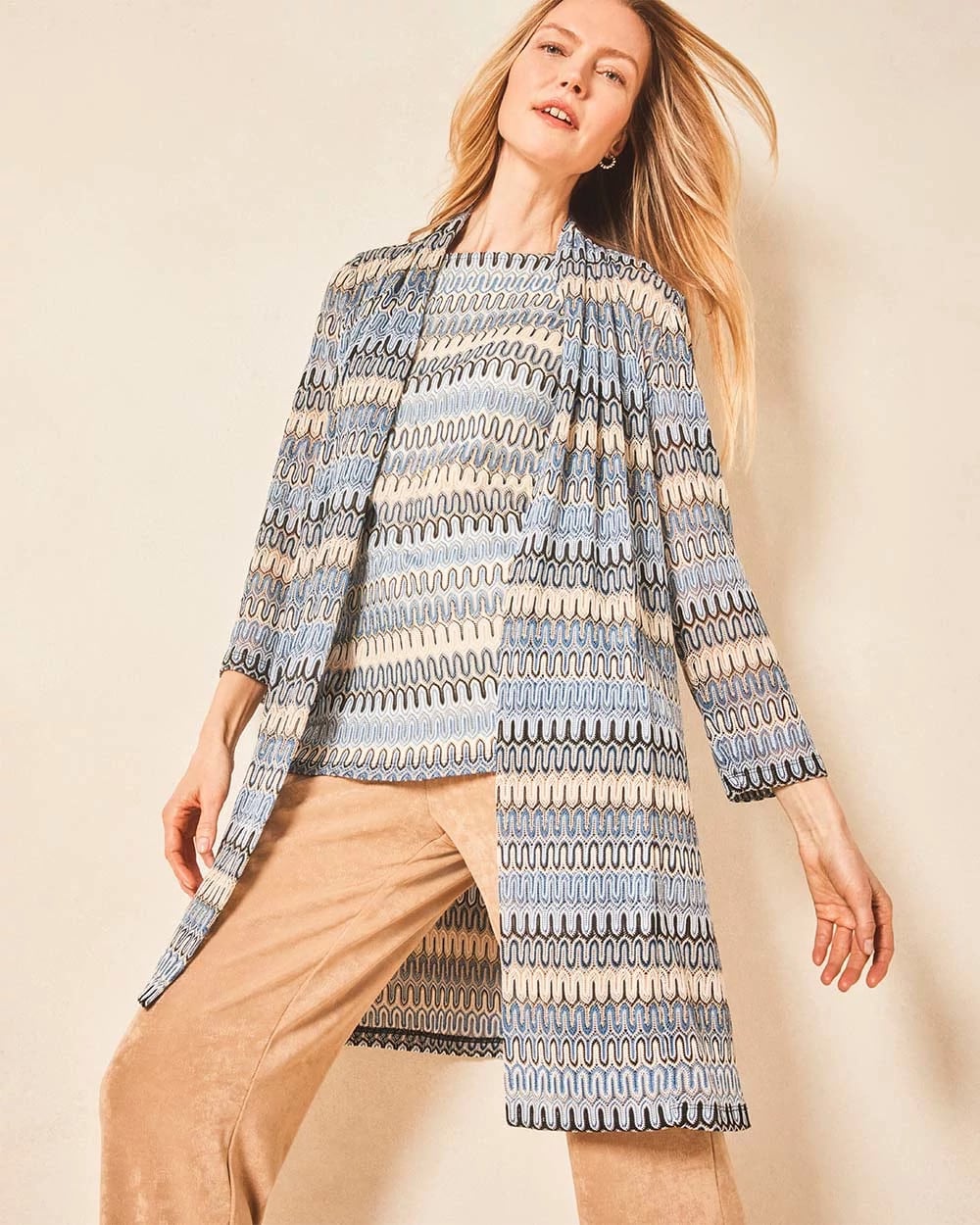 Cut from Travelers™ newest travel-friendly fabrication: soft to the touch, stretch-knit, this cardigan adds lightweight warmth with a beautiful drape. Perfectly packable, wrinkle-resistant, and versatile. Accented by thoughtful design elements including a comforting shawl collar united by the season’s chevron motif to bring dimension and a modern appeal.