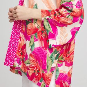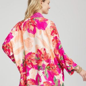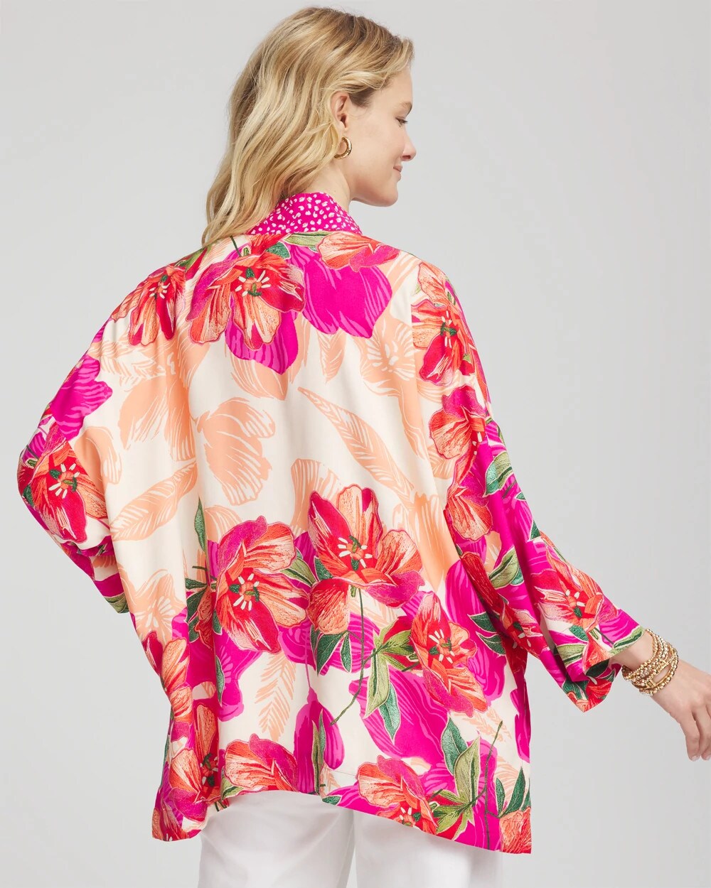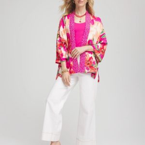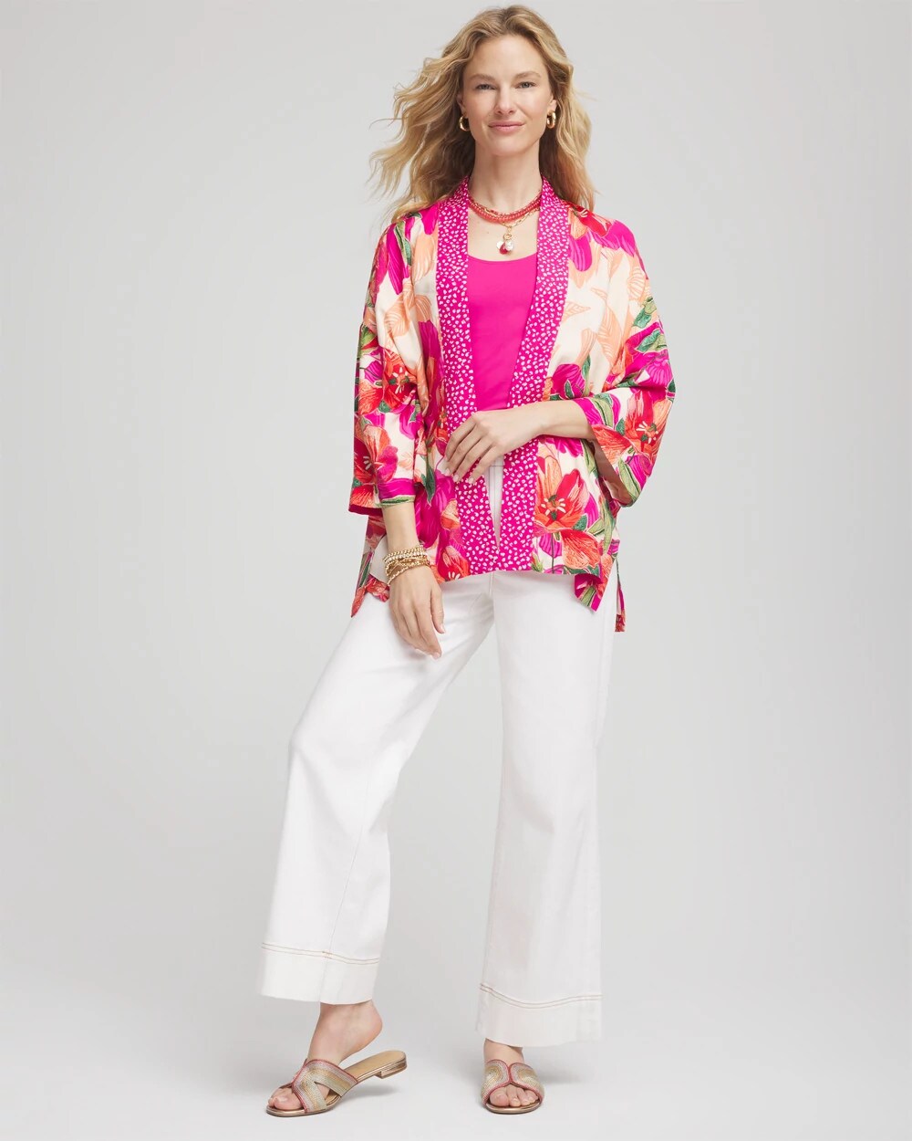 Perfect for topping everything from camisole’s to tees and tanks, this lined kimono adds a delicate, fashionable layer of femininity. Open-front short kimono with 3/4 sleeves, and an animal printed placket.